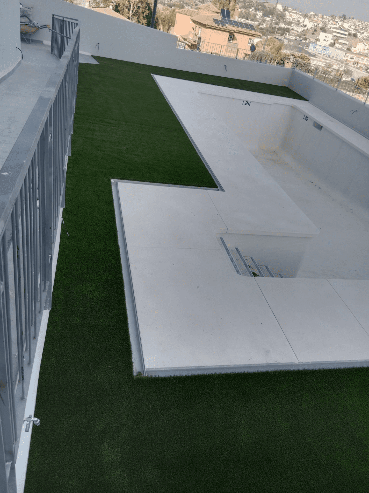 El césped artificial para piscinas es fundamental debido a su alta resistencia a la fricción y su uso intensivo en áreas circundantes.